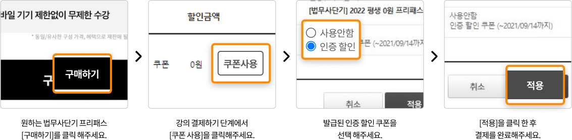 1. 쿠폰은 현재 판매중인 법무사단기 온라인 상품 (프리패스/패키지/단강좌) 결제 단계에서 사용 가능합니다.
